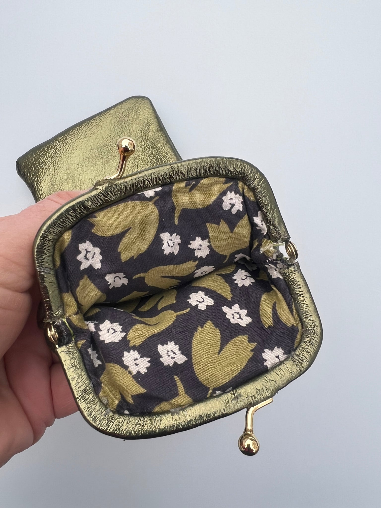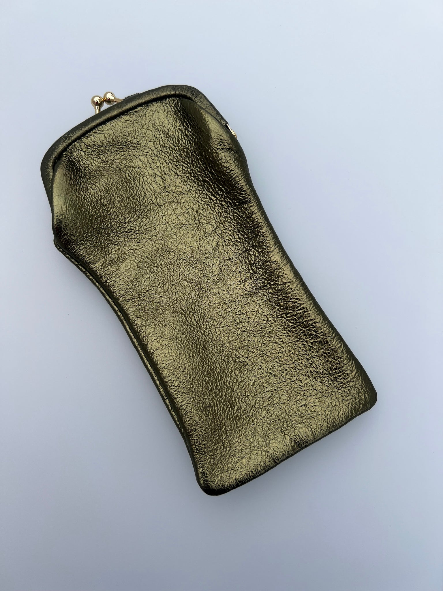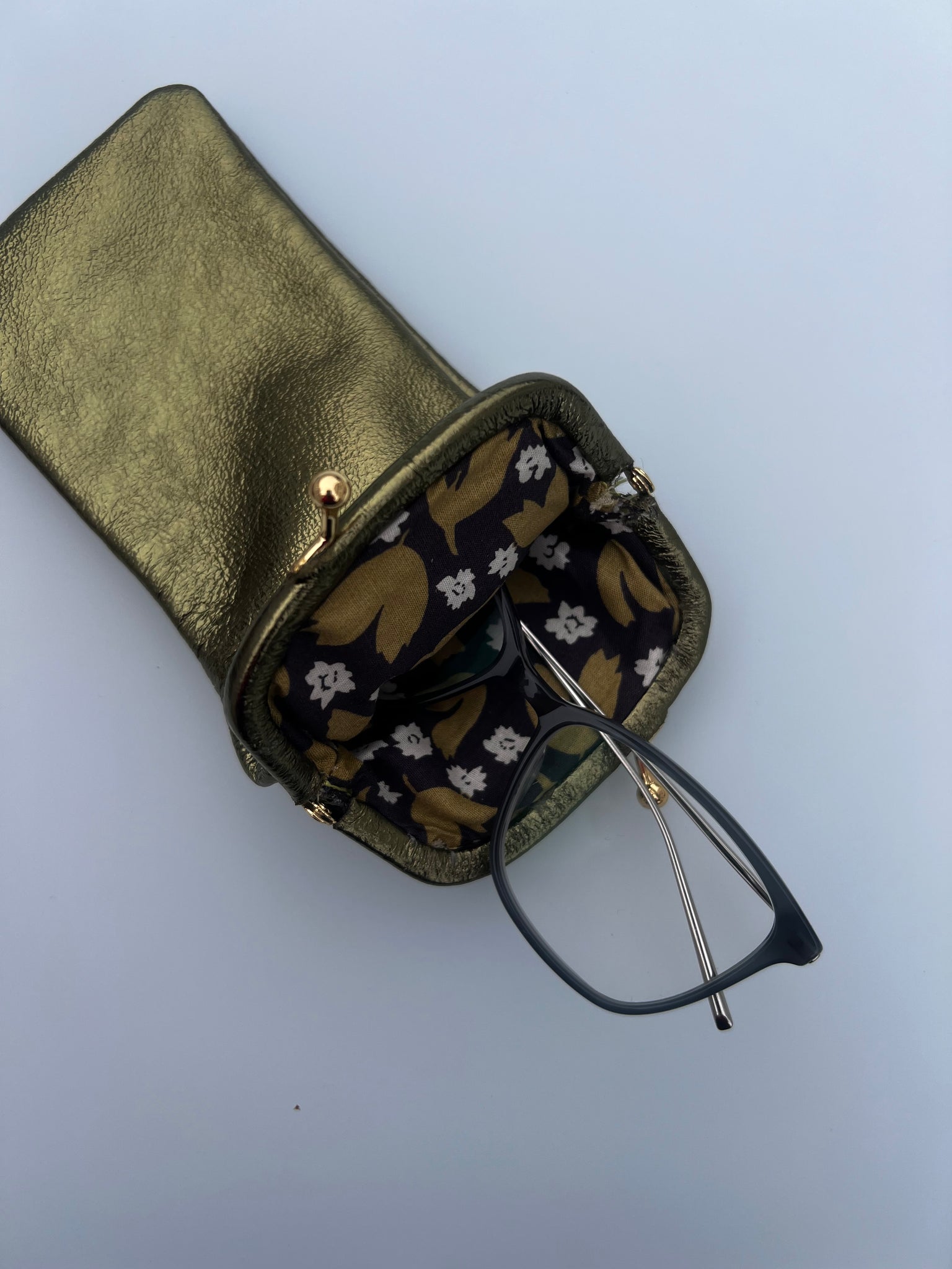 Brilleetui i ekte skinn med retro-spenne. Kommer i mange herlige farger og kult design med metallic skinn utenpå og søtt blomstrete bomullsstoff inni.