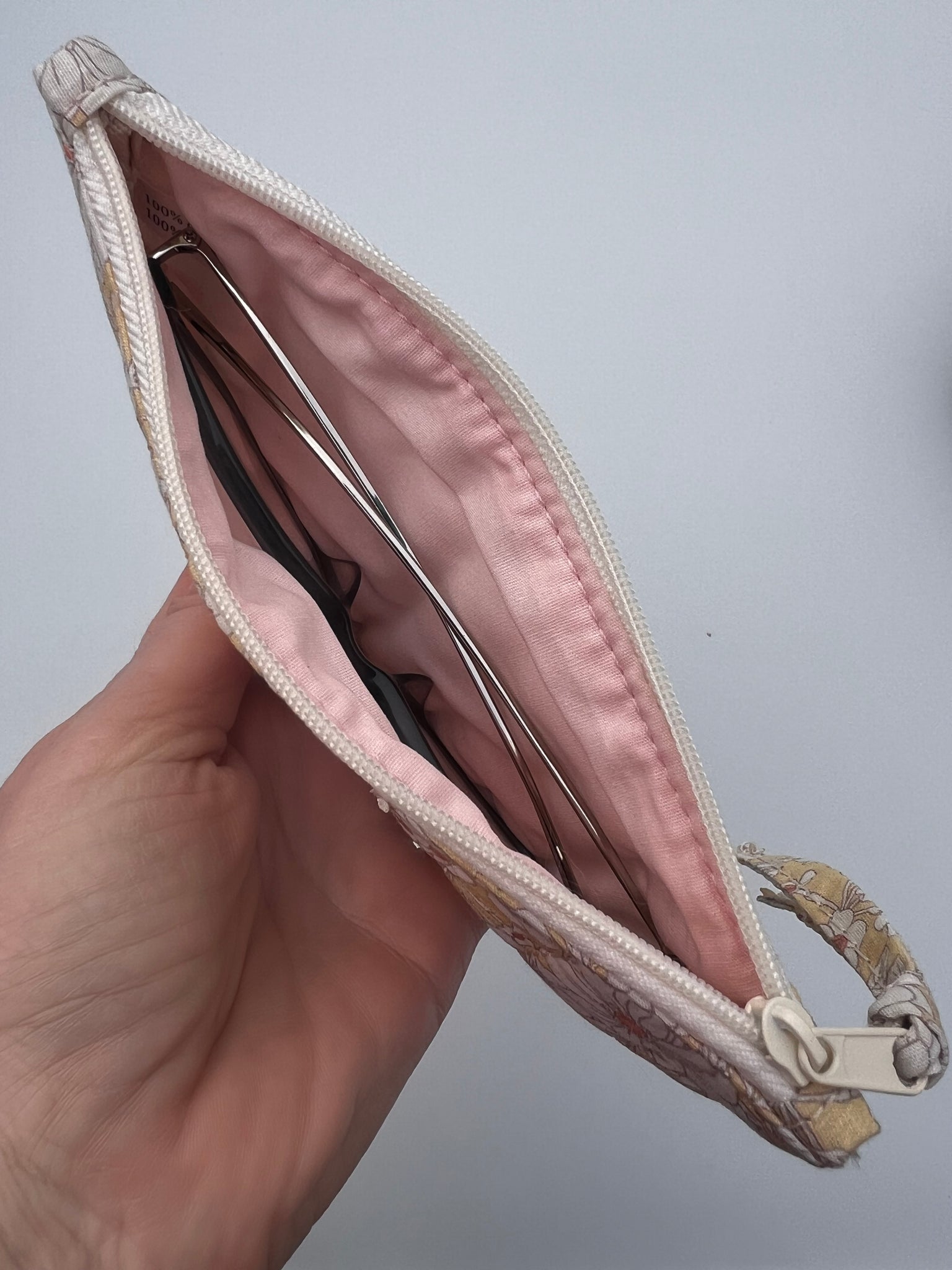 100 % bomulls brilleetui (innvendig og utvendig) for små til mellomstore brille. Veldig søte og praktiske med sitt enkle design. Glidelåslukning, håndlaget quilting, god tykkelse på polstringen, tykk tråd, nøye arbeid.
